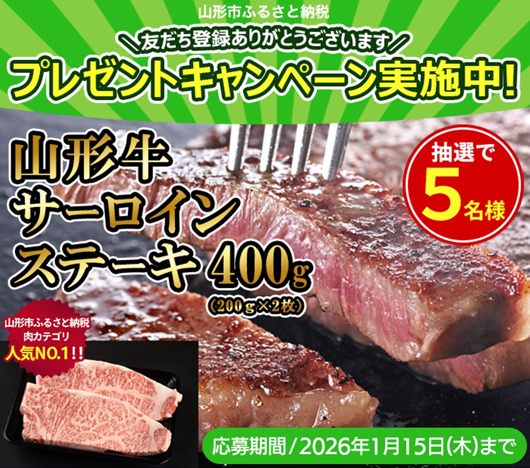 ただいま LINE友だち追加プレゼントキャンペーン実施中!公式アカウントを友だち追加していただいた方の中から、抽選で 山形市返礼品、肉カテゴリ人気NO1の『山形牛サーロインステーキ』 が当たります🎁🥩 この機会にぜひご登録ください!おすすめや最新ニュースもお届けします。 LINE友だち追加はこちらから